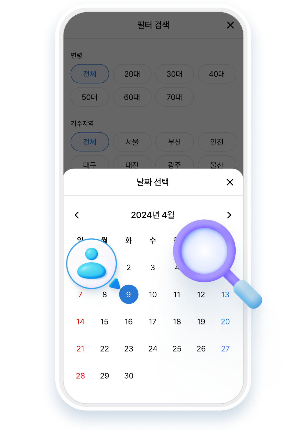 필드, 날짜, 시간, 금액, 인원 등 원하는 조건대로